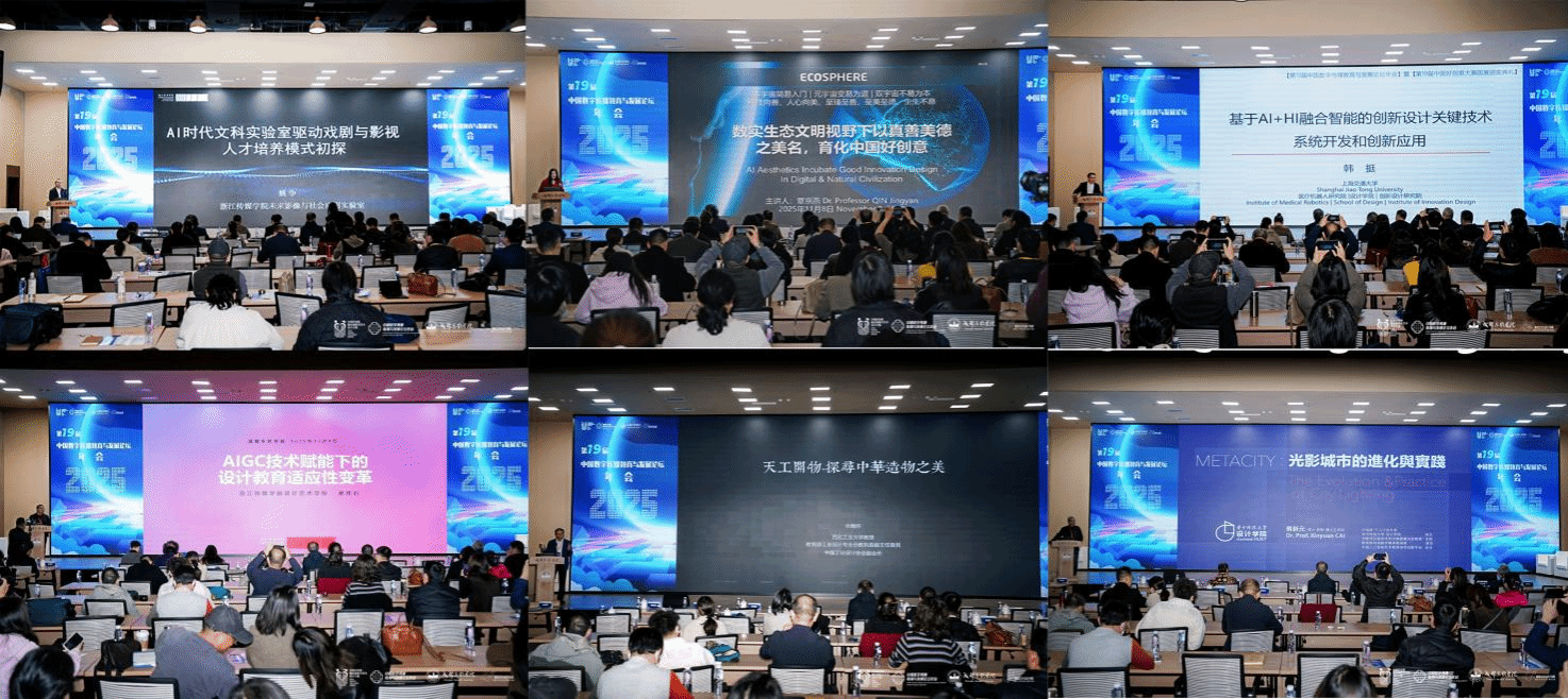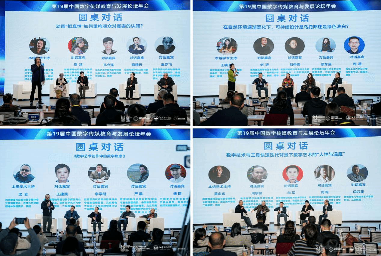学术交流环节聚焦行业前沿,上午由教育部高校戏剧影视专业教指委委员、浙江传媒学院副校长姚争教授、教育部长江学者覃京燕、韩挺及全国高校美育教指委委员金江波,分别围绕文科实验室建设、创意培育、技术融合、文化传承等主题作专题报告。同期,朱明健、吴小华两位专家分别主持“动画‘拟真性’与真实认知重构”“自然环境恶化下可持续设计定位”圆桌对话,为行业发展痛点建言献策。下午学术研讨持续深化,国务院学位委员会设计学学科评议组成员孙守迁、教育部相关教指委委员康修机、余隋怀、蔡新元等专家,依次围绕设计升级、专业改革、文化挖掘、AI应用等核心方向分享研究成果;梁岩、黄向东两位专家主持“数字艺术创作中的数字焦虑”“数字技术迭代下艺术的‘人性与温度’”专题对话,深化数字艺术人文价值探讨。